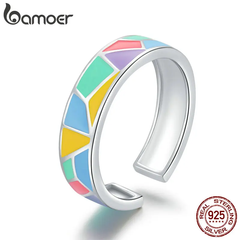 Name: Bamoer-Anillos abiertos para dedos de mujer, de Plata de Ley 925 geométrica, esmalte colorido, banda ancha, anillo de tamaño libre, joyería BSR126