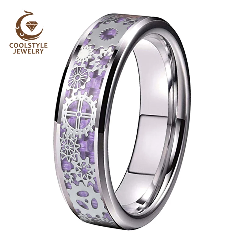 Name: Anillo de boda de carburo de tungsteno para hombre y mujer, rueda de engranaje, incrustaciones de fibra de carbono púrpura, bordes biselados, ajuste cómodo, 6MM